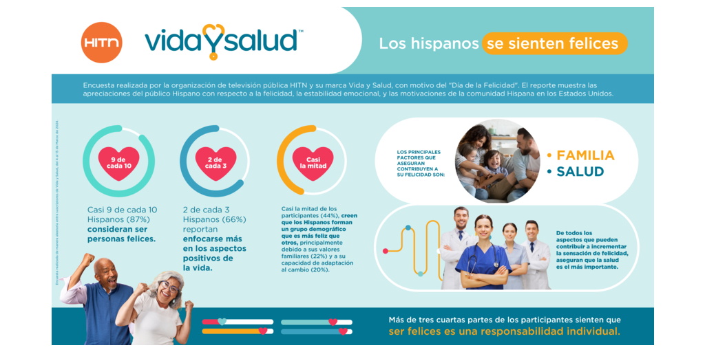 BROOKLYN, N.Y.–(BUSINESS WIRE)–El Informe sobre la Felicidad de los Latinos 2024, publicado hoy, indica que el 57% de los latinos que viven en EE.UU. se consideran felices. Un 30% adicional dice estar al menos algo feliz con su vida, mientras que un 13% informa sentirse infeliz. Realizado por Vida y Salud, la marca de salud y bienestar de la empresa líder de medios públicos hispanos HITN, para apoyar el Día Internacional de la Felicidad, el informe arroja luz sobre la felicidad, el bienestar mental y las motivaciones de la comunidad latina de Estados Unidos.