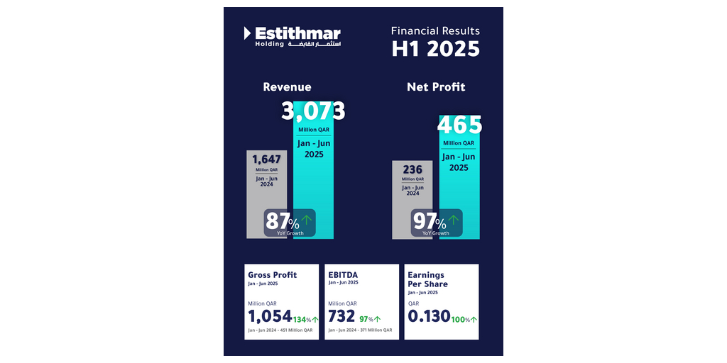 DOHA, Catar–(BUSINESS WIRE)–Con un rendimiento excepcional en todos los indicadores financieros clave, Estithmar Holding Q.P.S.C. anunció sus resultados financieros correspondientes al semestre cerrado el 30 de junio de 2025, tras la aprobación de su directorio.